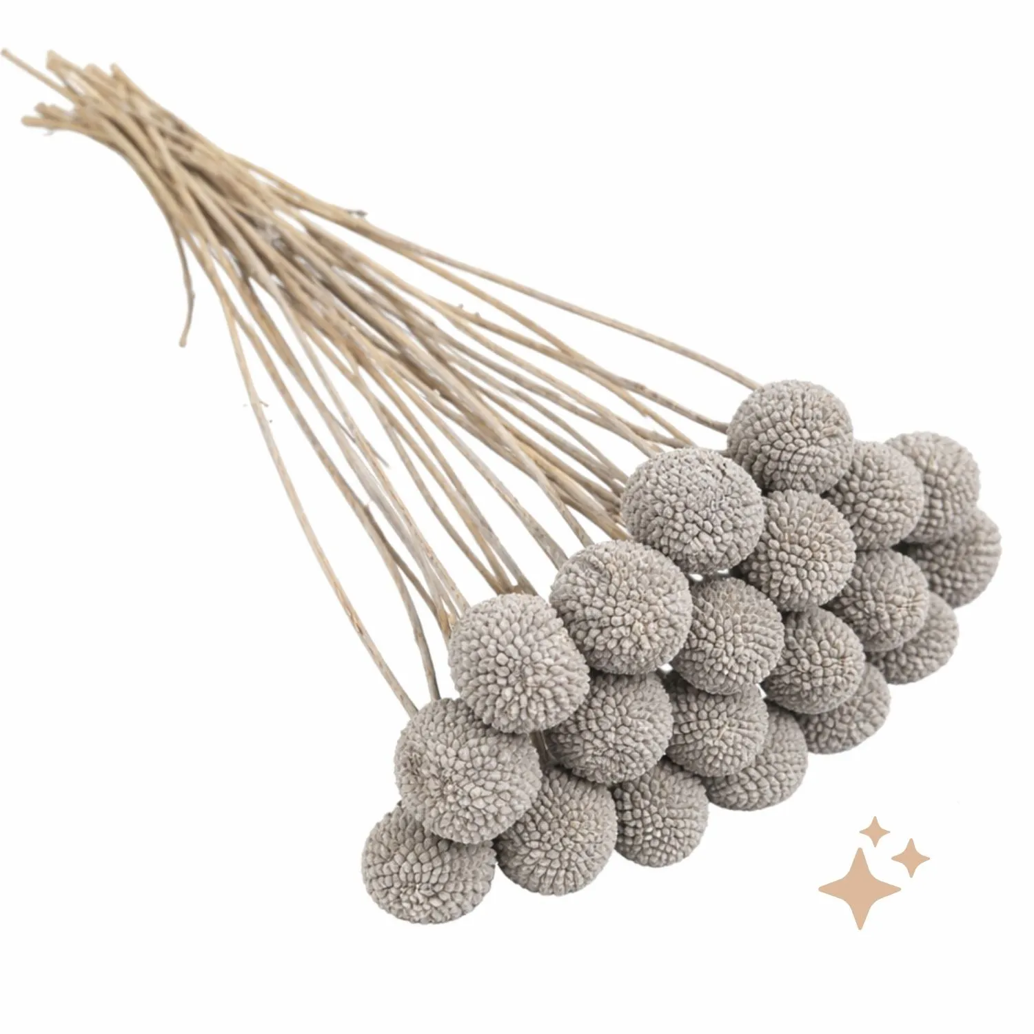 Introduce cool-toned texture and sculptural simplicity with Preserved Billy Buttons in versatile grey. Each stem features a distinctive round bloom, approximately 1–2cm in diameter, preserved to retain its shape and muted elegance. These Craspedia stems lend subtle structure to floral arrangements, event styling, and DIY floral design, pairing effortlessly with both monochrome and pastel palettes. Refined yet playful, their form and finish make them ideal for minimalist installations and tonal layering.