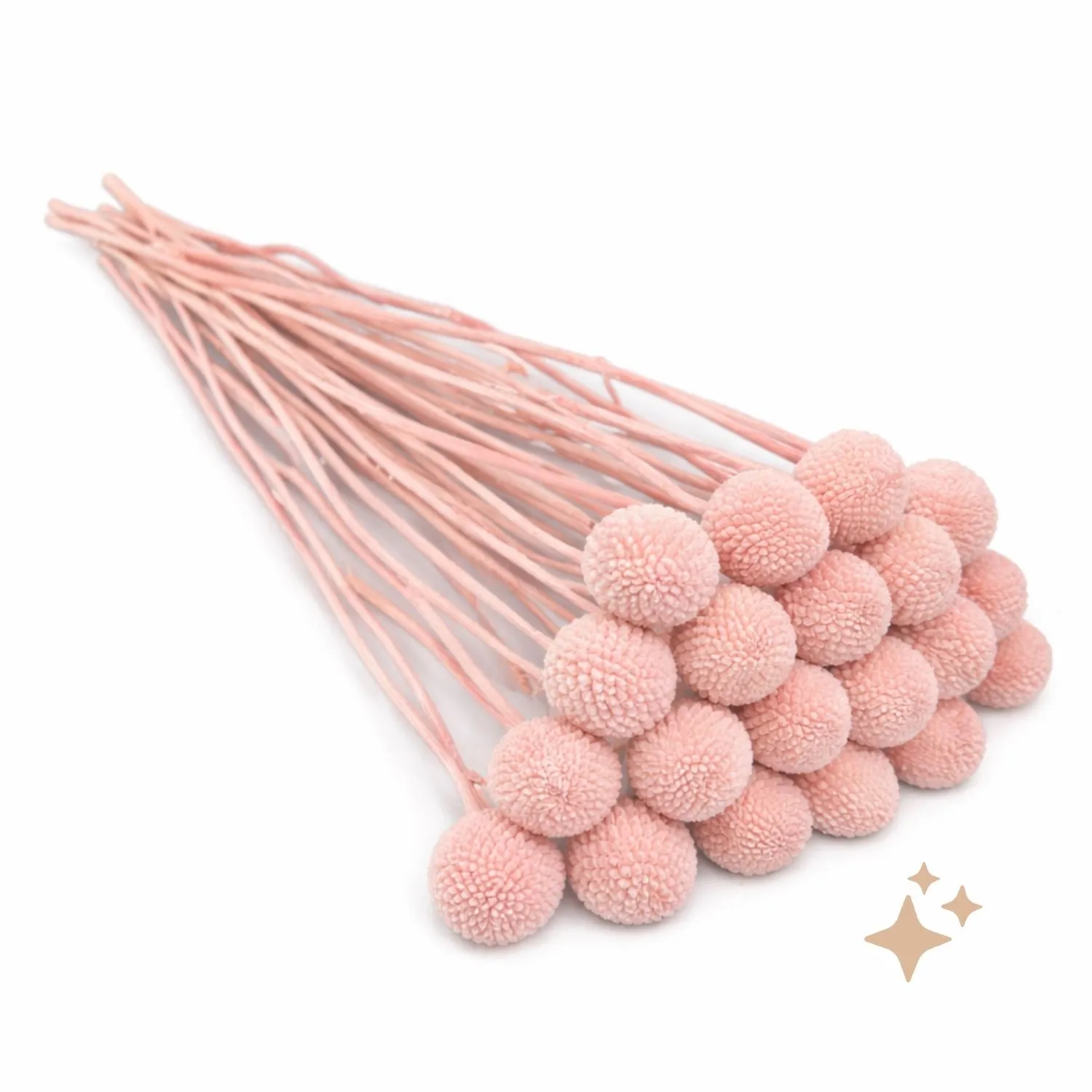 Bring cheerful colour and soft texture to your designs with Preserved Billy Buttons in pastel pink. Each stem features a distinctive round bloom, approximately 1–2cm in diameter, preserved to maintain its shape and delicate tone. These Craspedia stems are ideal for floral designs, event styling, and retail installations, adding a romantic yet structured element that complements both whimsical and refined compositions.