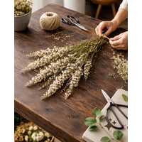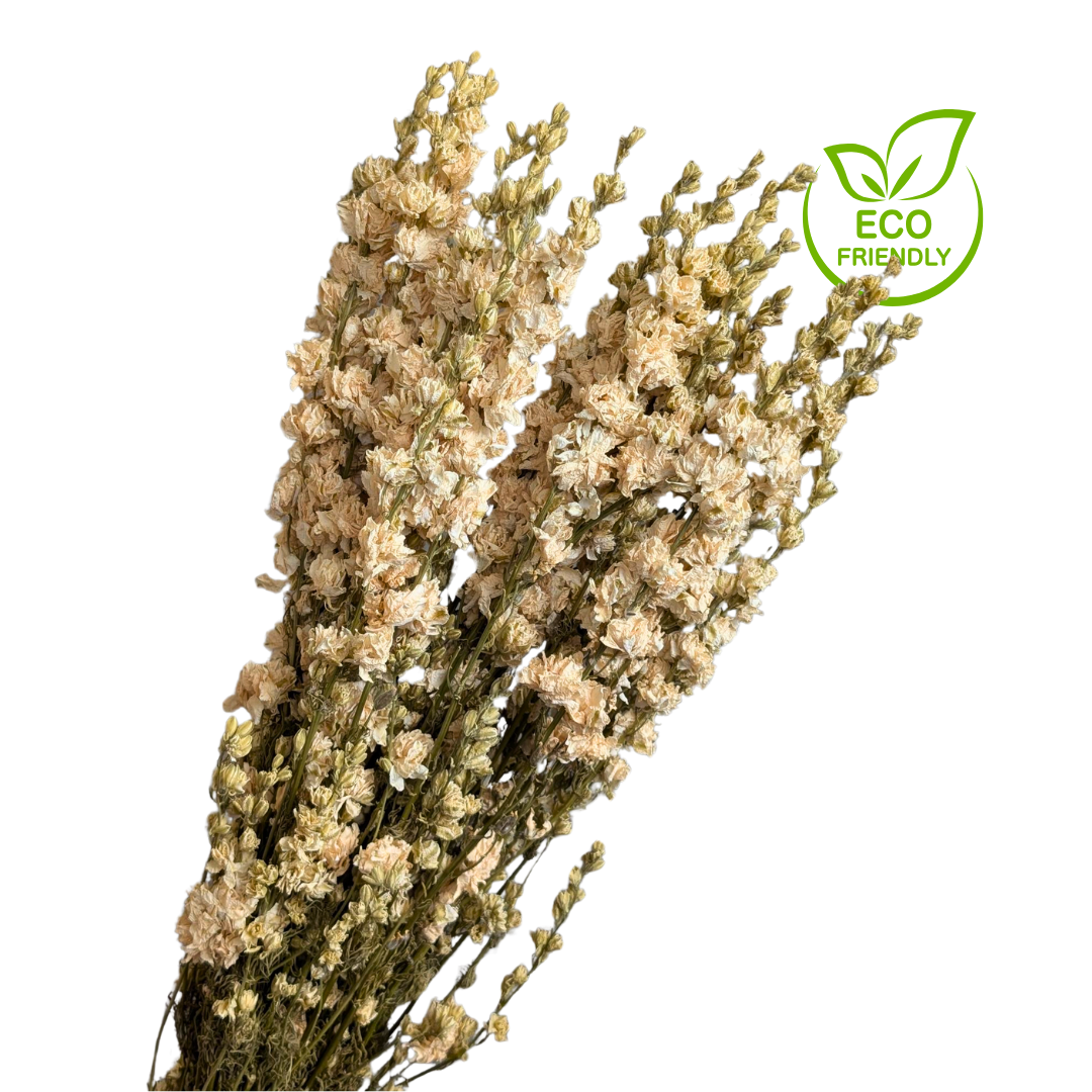 Introduce vertical elegance and soft neutrality with Natural White Dried Delphinium, featuring tall spires of delicate blooms that bring height, texture, and lightness to any arrangement. With stems measuring approximately 70cm, this variety is ideal for bouquets, ceremony backdrops, and retail displays that require structure and visual impact. Its naturally dried finish offers a zero waste, low-maintenance alternative to fresh florals—perfect for event prep, DIY styling, and home décor.