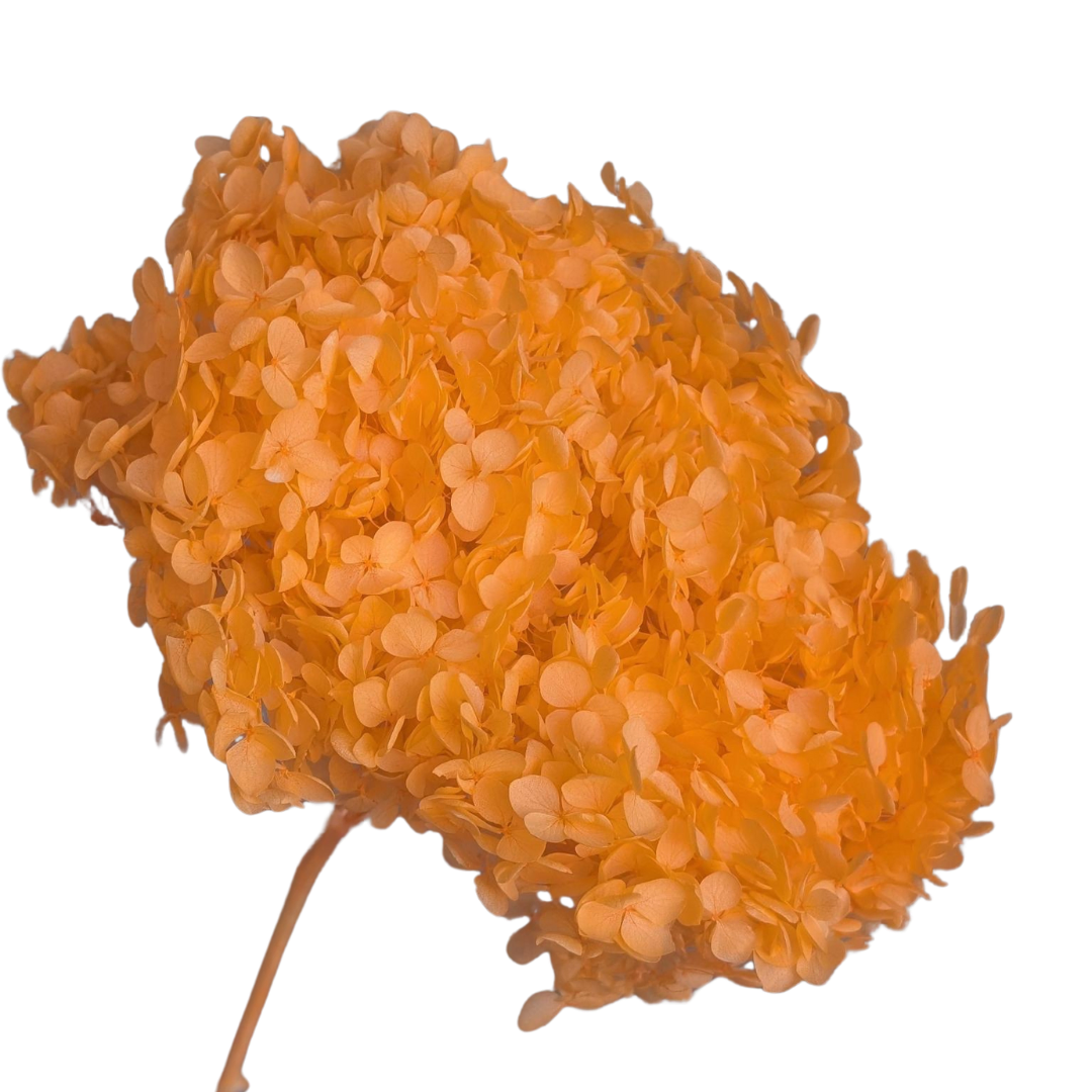 With soft small petal clusters (±2cm) forming a generous dome-shaped bloom, the Preserved Hydrangea – Orange brings a warm, citrus-inspired vibrancy to floral styling. Its bloom diameter of approximately 18–23cm adds volume and a cheerful burst of colour to installations, wedding florals, and seasonal compositions.