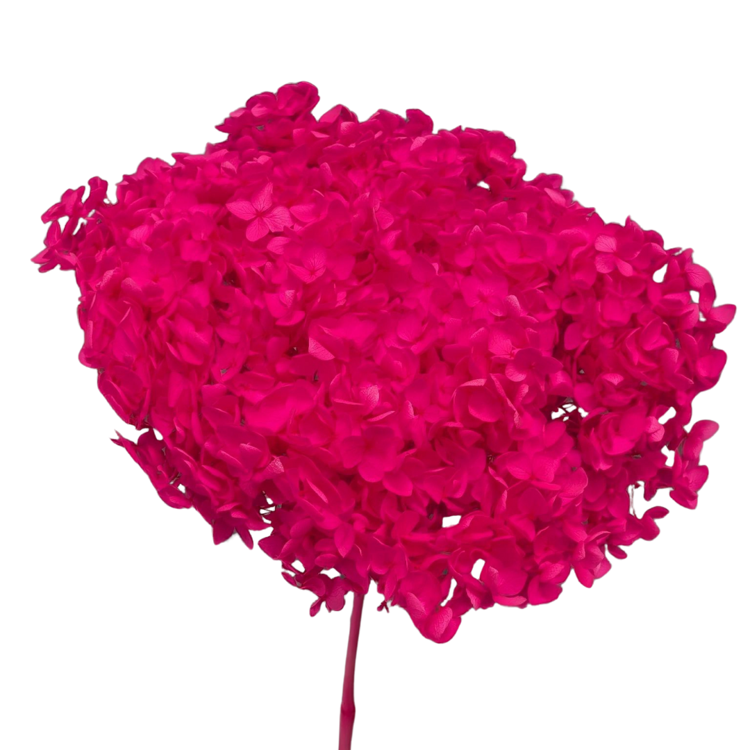 With soft small petal clusters (±2cm) forming a generous dome-shaped bloom, the Preserved Hydrangea – Hot Pink delivers a bold, energetic tone that radiates confidence and vibrancy. Its bloom diameter of approximately 18–23cm adds volume and a striking pop of colour to installations, wedding florals, and seasonal compositions.