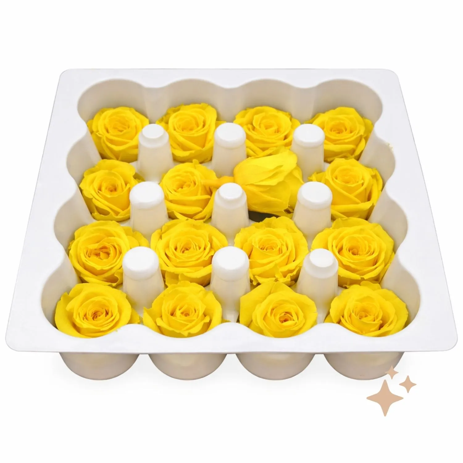 A 16-pack of Vermeille Ava preserved spray roses in radiant Canary Yellow, with each bloom measuring approximately 2.3–2.7cm in diameter and a short stem of 0.5cm, ideal for wiring into vibrant floral designs. This joyful hue adds a burst of sunshine to wedding bouquets, corsages, cake styling, and event décor, offering lasting colour with eco-conscious preservation and zero waste.
