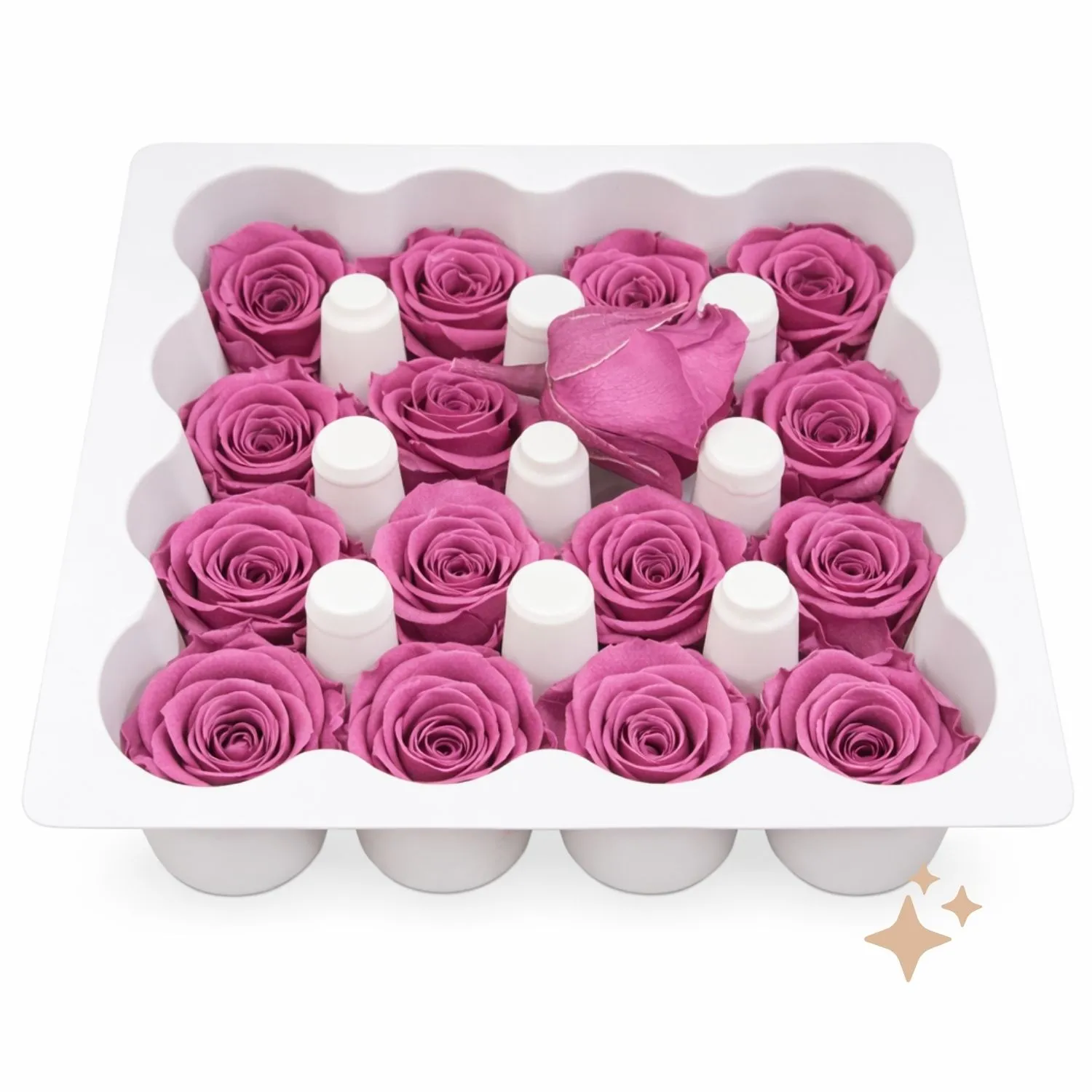 A 16-pack of Vermeille Ava preserved spray roses in luxurious Rose Wine, with each bloom measuring approximately 2.3–2.7cm in diameter and a short stem of 0.5cm, ideal for wiring into expressive floral arrangements. This deep, romantic hue adds a sophisticated flourish to formals, buttonholes, corsages, and wedding florals, offering lasting colour with eco-conscious preservation and zero waste.