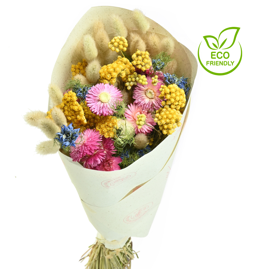 3. ECO-FRIENDLY CHOICE: Our bouquets with the Eco-Friendly mark are made from sustainably dried flowers and require no water or additional resources, making them an environmentally friendly option for your home or office. Even the paper sleeve is made from dried flower waste!