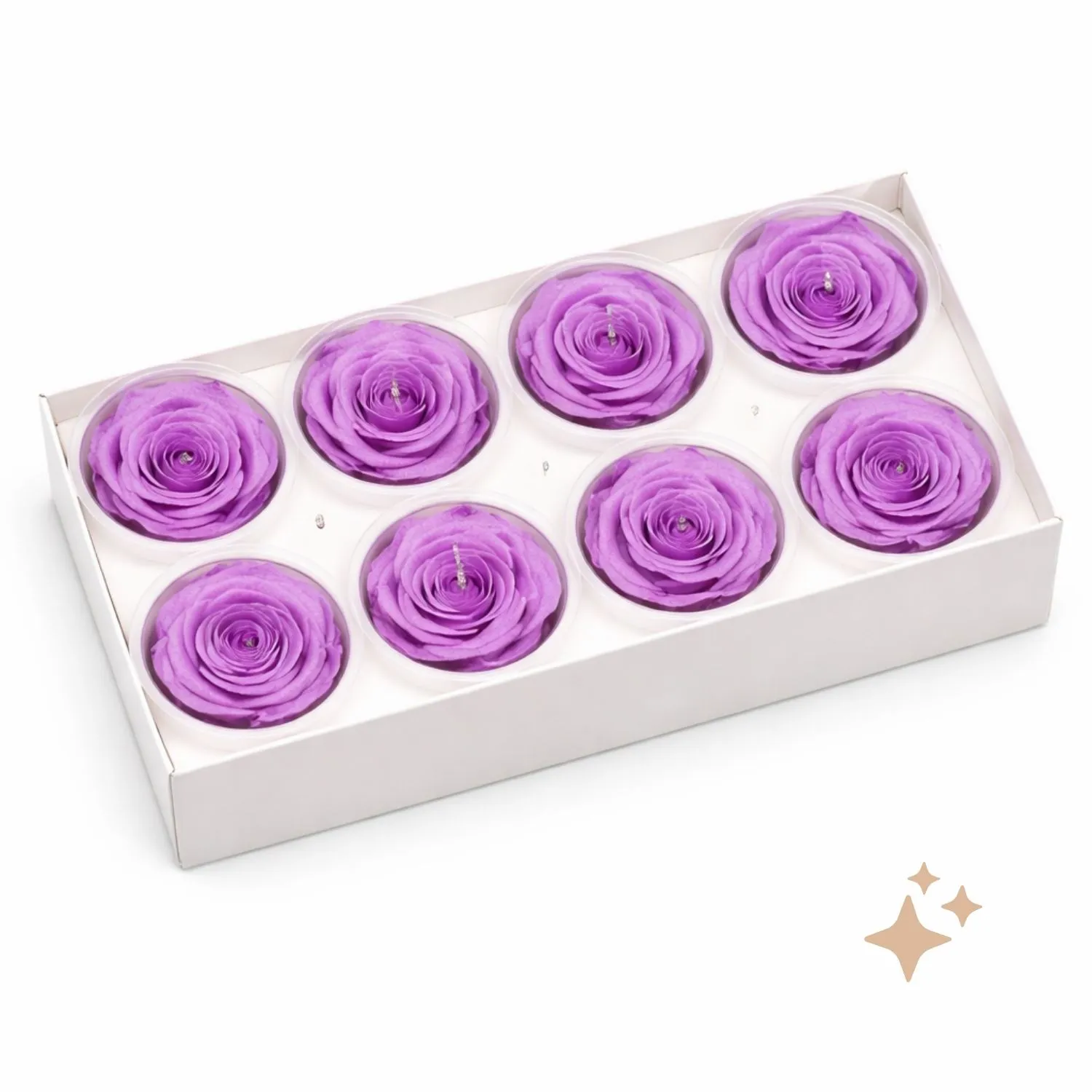 An 8-pack of Kiara preserved roses in soft Baby Lili mauve, each featuring a delicate 5cm bloom and short stem. These roses are ideal for floral design, including bouquets, corsages, table arrangements, and event styling. Their gentle hue makes them perfect for weddings, formals, and cake décor, with the added benefit of long shelf life and zero waste.