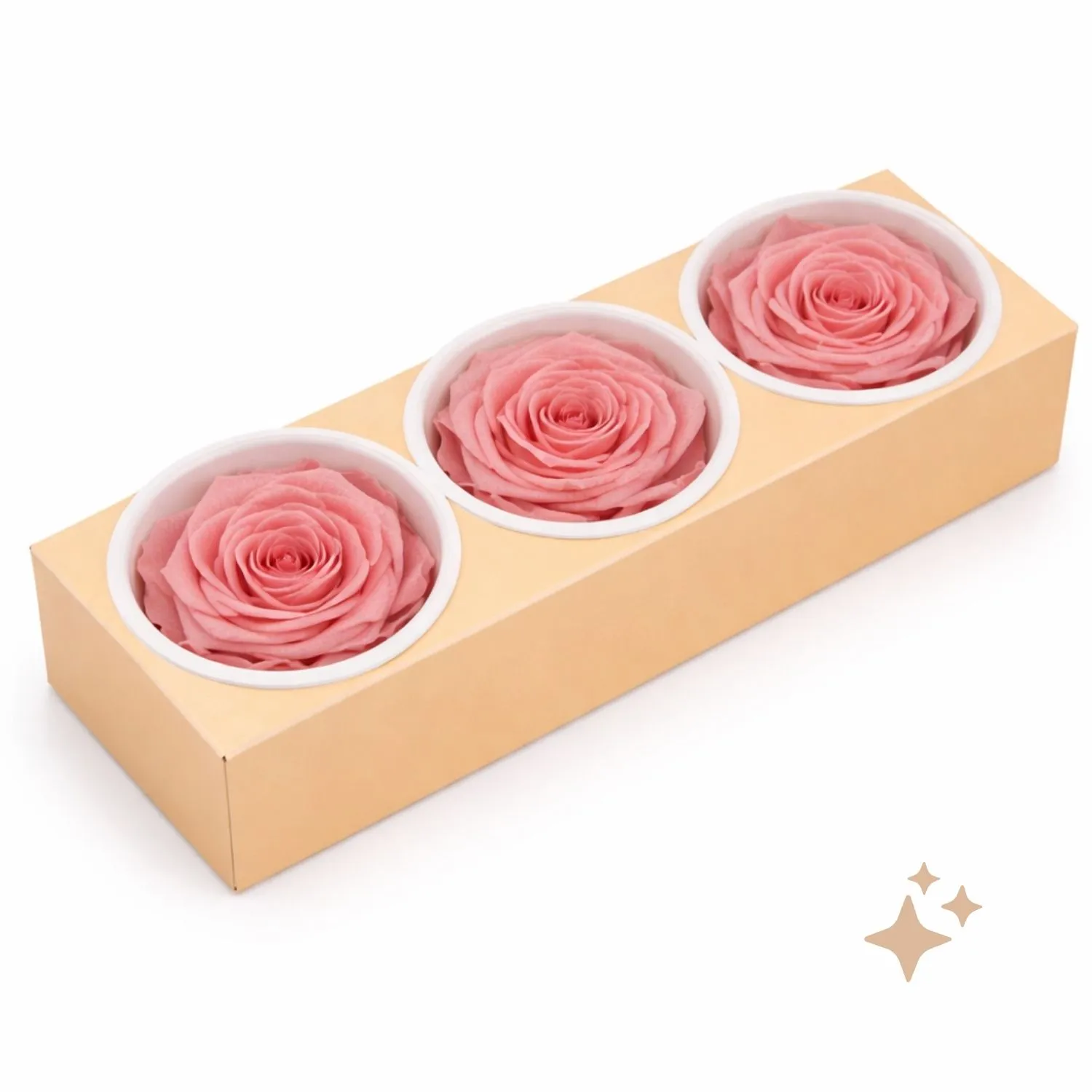 A 3-pack of Vermeille Monalisa preserved roses in soft Baby Pink, each with a generous 6cm bloom and short stem for easy styling. Perfect for bouquets, gift boxes, and event décor, these pastel roses offer a romantic touch with long shelf life, zero waste, and eco-friendly preservation.